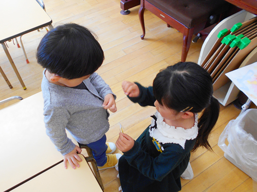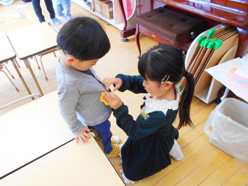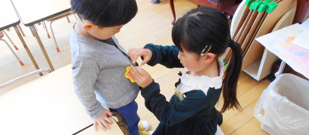 例えば、自分の名札がつけられずに困っている小さい人には、大きいクラスの人が「つけてあげようか?」と名札をつけてくれます。