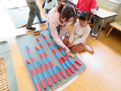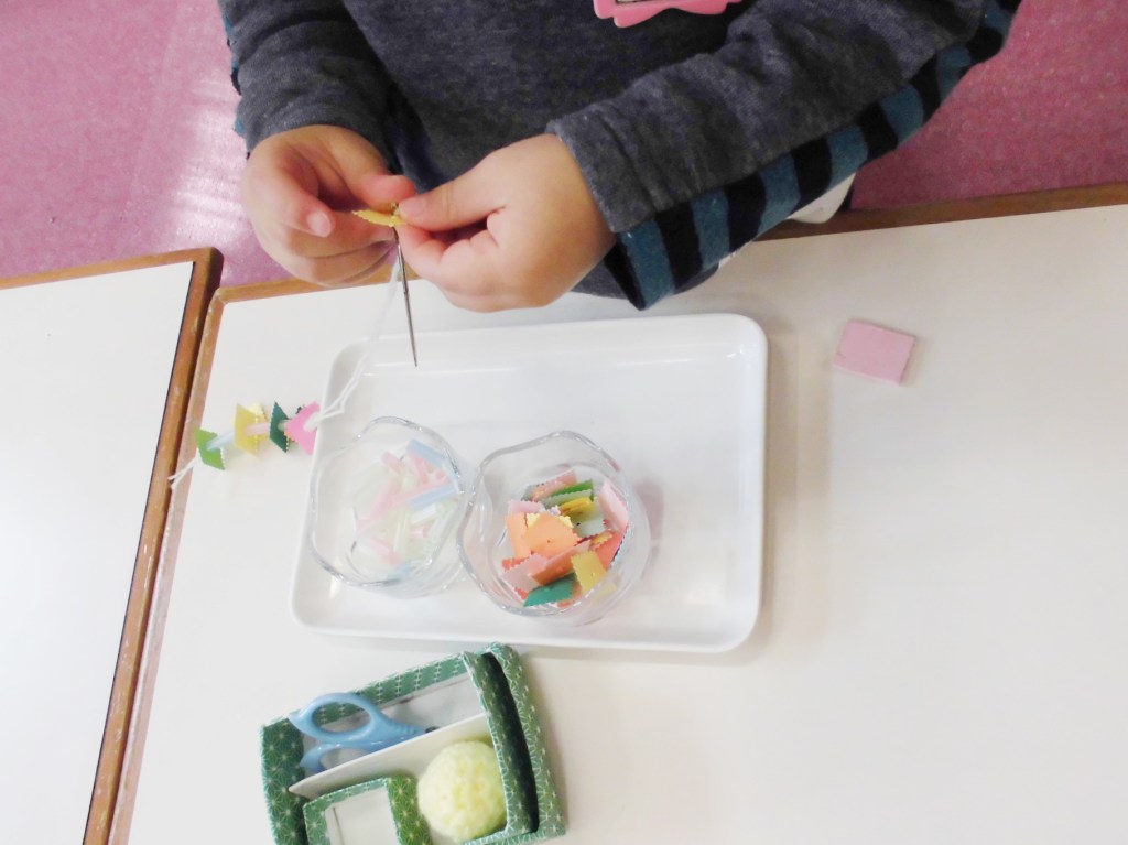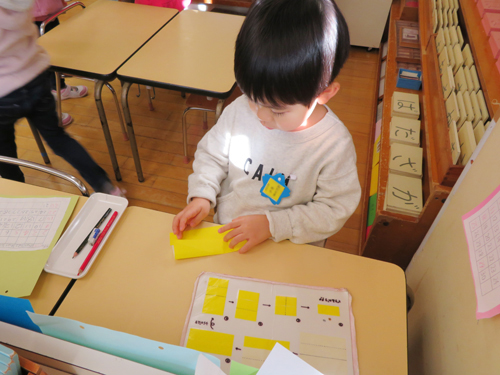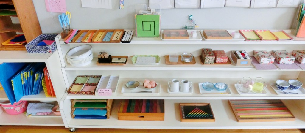 この様に保育室には、5〜6個の棚がいつも一室にあり、先生に言われなくても子どもは自分の必要に応じて教材を使い、また元に戻す生活ができるようになります。