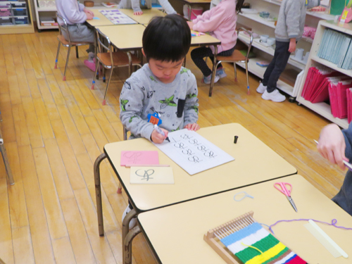 その他、字に関心のでた子には砂文字が用意され、まずは手で何回も砂の上をなぞることを先生と一緒にします。次は道具をもって溝(みぞ)をなぞっていきます。最後にはえんぴつで書けるようになります。2年から3年かけて、50音が書けるようになります。