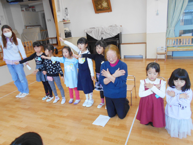 クリスマスお楽しみ会では、全園児が2階ホールにてイエス様の誕生を祝います。サンタクロースからのプレゼントがあります。その後、各クラスでクリスマス食事会をします。