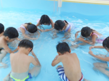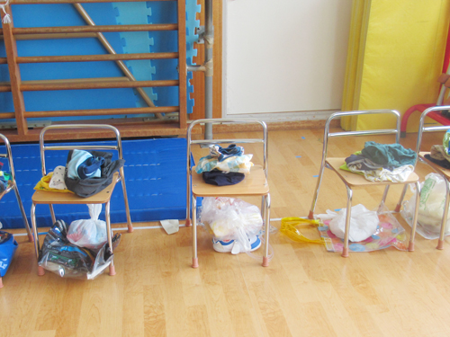 プール活動では、一人で着替える事ができる環境を作っています。着脱し整理できるように「脱いだら、たたむ」ことを教えます。難しい所は大人がやり方を教えて、子どもが一人でできるように助けます。0,1,2歳さんでもちゃんと自分でできるようになります。