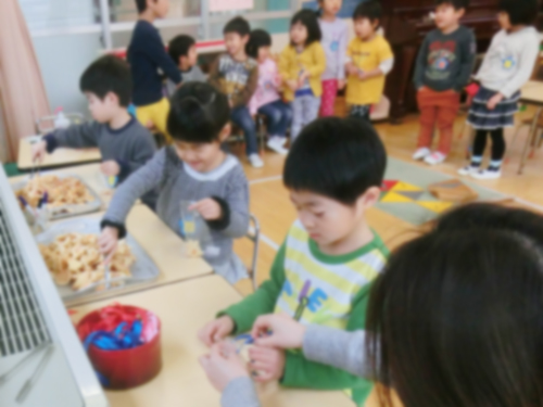 節分の日の約2週間前から、各部屋で「鬼のお面」工作が出るので、自分の好きなようにお面を作り、当日はそれを被って豆まきをします。