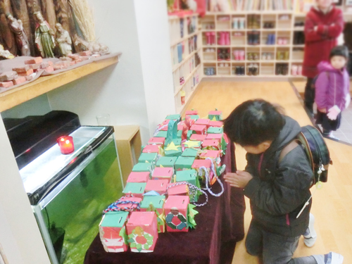 クリスマスまでの期間、子ども達はイエス様のために心のプレゼントを捧げます。好きな物をもらったり、ごちそうを食べたりするだけのクリスマスではなく、本当のクリスマスを迎える準備をします。イエス様は何をあげると喜ぶのかな?と、子ども達はいろいろ考えています。