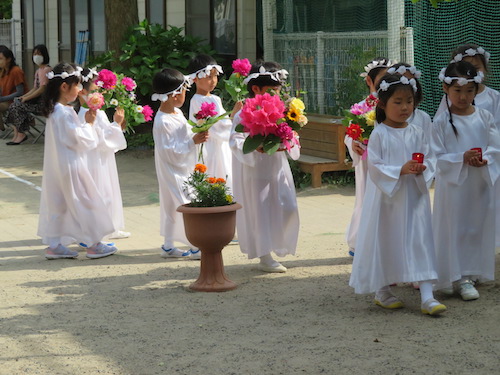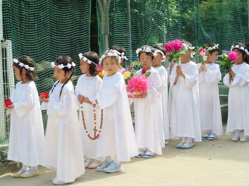 毎年、年長クラスは、白い衣装に身をつつみ、ロザリオや花束をもって、園庭のルルドのマリア様の御像まで行列で歩いていきます。